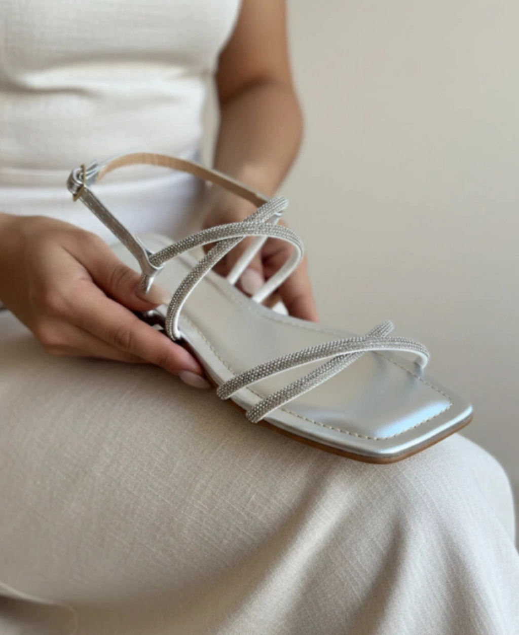 Composta por tiras finas em X cravejadas em strass, ela envolve o pé com leveza e brilho, garantindo um toque moderno e feminino.